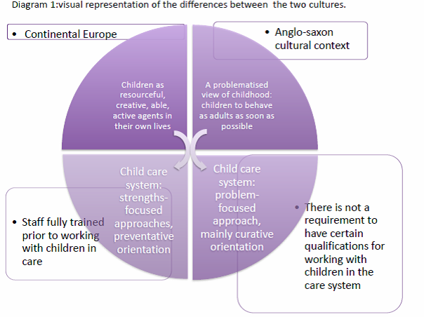 There are fundamental similarities by which continental European societies look after their most vulnerable children and young people. The United Kingdom has a long tradition in social work while a tradition of social pedagogy was also developed within continental Europe. In both, safety and wellbeing are at the centre of legislation and working practice. At the same time, there are differences in how children and young people are socialised and educated in continental European countries and what is considered the mainstream approach in the United Kingdom. These differences are primarily related to different social constructions of the ‘image of the child’. The latter refers to what kind of value children have in their society and which expectations and aspirations they live under. The attention paid to this idea has varied, for example, the sociology of childhood is important in some fields but rarely acknowledged in others, including policymaking. The image of the child in a determined place and time is a social construct, “always present and influential, but in policymaking, they are usually implicit, and therefore not discussed” (Moss, P. 2010).