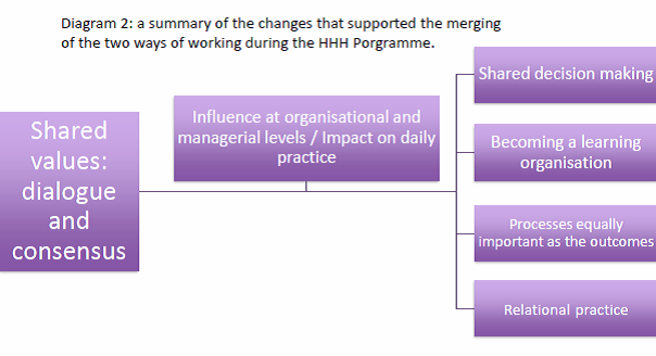 Social pedagogues consider important to share a clear and unified value base with those who they work with, this serves as a reference to sustain and guide practice for practitioners sharing a working environment or professional responsibilities with a specific group. When a social pedagogue makes decisions, she has to use value-based assessments, combined with theory applied to her practice through reflection in action, and this is done in dialogue with others, the client and the other colleagues or professionals. It is rather about ethics and values than methods and techniques (Storø, 2013). Thus, social pedagogy is a combination of theory, research and Haltung. During the HHH programme, the social pedagogues noticed a need for further dialogue around the value base of practice. This situation contributed at times to a certain degree of inconsistency in practice that was also a result of the confusion over continuing governmental changes and political and financial agendas brought to the field.