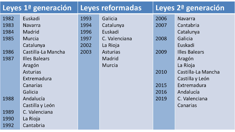 Para situarnos en los respectivos SSS autonómicos es preceptivo referirnos a sus leyes en esta materia. Una vez aprobada la Constitución de 1978, todas las CCAA promulgaron con más o menos diligencia (puesto que se tardó diez años en completarlas) su respectiva ley de servicios sociales; estas fueron las que se consideraron de primera generación. En los siguientes diez años, algunas CCAA reformaron aquellas primeras leyes pero las que las reemplazaron no significaron, en general, un cambio substantivo. No obstante, desde el año 2006, coincidiendo con la reforma de muchos estatutos de autonomía y la promulgación de la Ley de Promoción de la Autonomía Personal y Atención a las Personas en Situación de Dependencia, se inició una nueva generación de leyes que se extiende hasta nuestros días (ver gráfico 1).