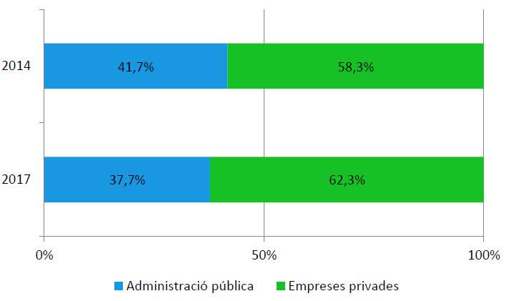 Sobre los sectores que contratan a las/los educadores sociales, el mismo informe del CEESC presenta los siguientes datos: el 37,7% de los educadores/as ocupados están trabajando en el sector público mientras que el 62,3% lo hacen en el sector privado (no se especifica si este es con o sin ánimo de lucro). Esta distribución que responde al año 2017, comparada con la de 2014 que era del 41’7% y 58’3 respectivamente, permite afirmar que el porcentaje de las personas que trabajan para una administración pública ha ido disminuyendo en los últimos años, lo cual se atribuye a la externalización de servicios de las administraciones hacia el sector privado.