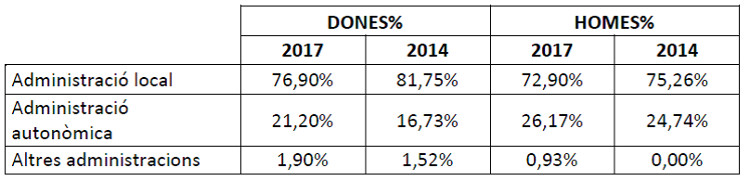 A su vez, la distribución según género de los contratos de las administraciones públicas se distribuyen de la siguiente manera: el 76’9% de las educadoras sociales, van a trabajar a las administraciones locales y el 21’2% a la autonómica, mientras que los datos para los educadores son de 72,9% y 26’7% respectivamente. Por lo tanto vemos que las educadoras están ligeramente más representadas que los educadores en el sector público local, mientras que sucede al revés en el sector público autonómico. Al mismo tiempo se constata una ligera tendencia a la baja respecto a los contratos que tenían las administraciones locales en 2014 (el 81’75% de educadoras y el 75’25 de educadores) y, durante el mismo periodo, un incremento en la administración autonómica (el 16,73% para ellas y el 24,74% para ellos).