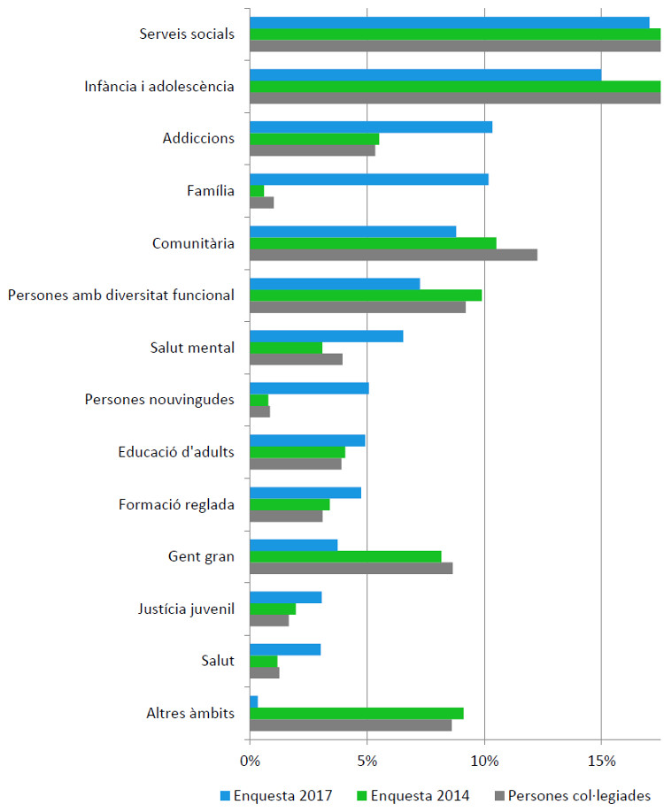 El CEESC manifiesta que existe una gran dispersión respecto a los ámbitos de intervención de las educadoras o educadores sociales y, además, una notable fluctuación del peso de cada ámbito sobre el conjunto en el transcurso del tiempo. Así, y tal como tipifica este estudio los ámbitos de inserción laboral, el de servicios sociales y el de infancia y adolescencia son los que más profesionales de la educación social congregan (el 15% o más) y de forma bastante sostenida en los últimos años. Le seguirían a bastante distancia los ámbitos de adicciones y el de familias (ambos en torno al 10%). Y el tercer grupo lo formarían los que trabajan en el ámbito comunitario, el de personas con diversidad funcional, el de salud mental y el de personas inmigrantes (entre el 5 y el 10% cada uno). Todos estos ámbitos entendemos que forman parte del conjunto de prestaciones de servicios que gestionan los SS; los únicos que quizás podrían considerarse como socio-sanitarios serían el de adicciones y el de salud mental.