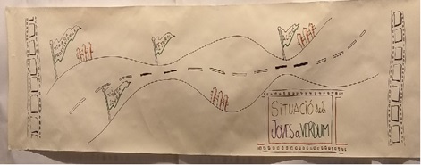 “Han quedado dibujados dos grandes bloques temáticos a trabajar: una línea en torno la sensibilización, formación y autoformación alrededor de la cuestión de género y LGTBI+; y otra de generación de actividades de ocio para hacer en el barrio, primordialmente en el espacio público. […] También se toma la decisión de empezar a constituirse como grupo de jóvenes y organizar una actividad por Festa Major.[25] El grupo decide volverse a encontrar en julio para construir la programación de la jornada. Se decide que después de la actividad se retomaran los encuentros de grupo para valorar el evento y planificar las siguientes acciones a desarrollar.” (Anexo 6, Trabajo de Campo, Sesión 10, pg. 31-32)