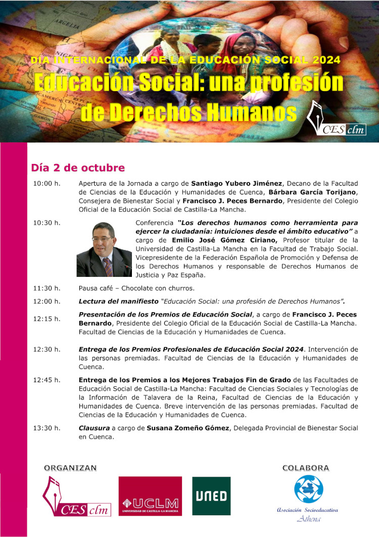 12:15 h. Presentación de los Premios de Educación Social, a cargo de Francisco J. Peces Bernardo, Presidente del Colegio Oficial de la Educación Social de Castilla-La Mancha. Facultad de Ciencias de la Educación y Humanidades de Cuenca.