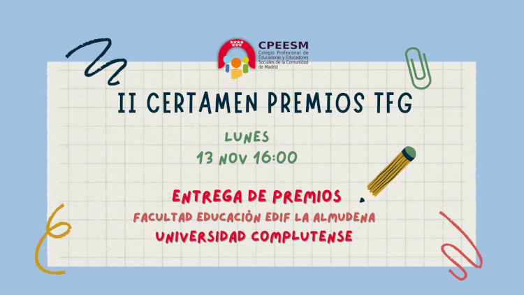 El lunes 13 de noviembre de 2023 tuvo lugar el acto de entrega de los premios Educación Social 2023, según el fallo del jurado. Premios convocados por el Colegio Profesional de Educadoras y Educadores Sociales de la Comunidad de Madrid (CPEESM)