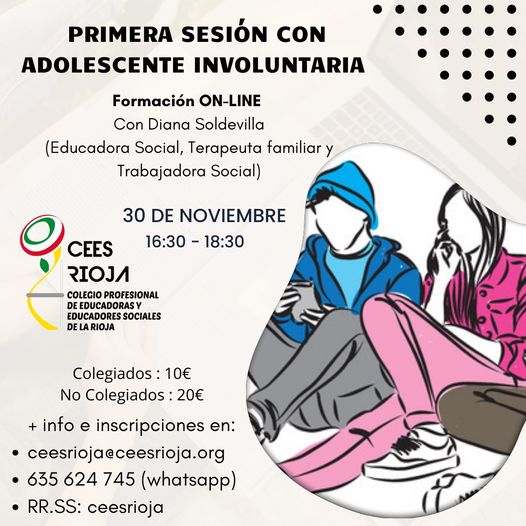 El Colegio Profesional de Educadoras y Educadores Sociales de La Rioja (CEESRIOAJA) organiza el 30 de noviembre de 2023, de 16:30 a 18:30, la primera sesión de «adolescente involuntaria», formación on-line con Diana Soldevilla (Educadora Social Terapeuta familiar y Trabajadora Social)