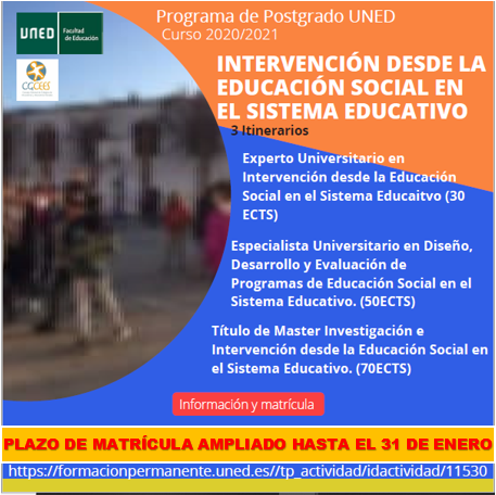 Debido al interés mostrado por parte de las y los educadores sociales en el Programa Modular de Intervención desde la Educación Social en el Sistema Educativo, se ha ampliado el plazo de matrícula hasta el 31 de enero de 2021.