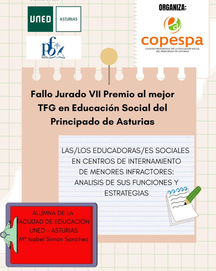 El Colegio Profesional de la Educación Social del Principado de Asturias (COPESPA) publica en sus redes sociales (Facebook) la siguiente información: Fallo del Jurado del VII Premio al mejor TFG…