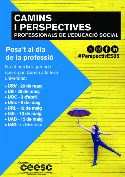 La jornada está organizada por el Colegio de Educadoras y Educadores Sociales de Cataluña en colaboración con las universidades catalanas: Universidad de Lleida, Universidad Rovira i Virgili, Universidad de Barcelona, Universidad Autónoma de Barcelona, Universidad de Girona, Universidad Ramon Llull – Fundación Pere Tarrés, Universidad de Vic y Universidad Abierta de Cataluña».