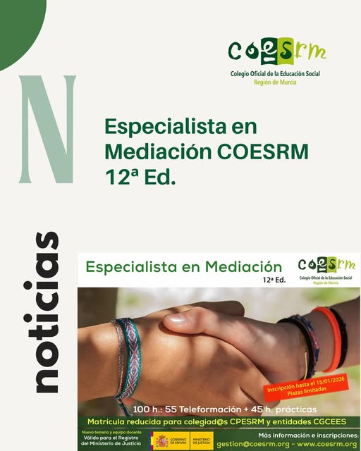 El Colegio Oficial de la Educación Social de la Región de Murcia (COESRM) informa en su web y redes sociales (Facebook) de la siguiente actividad formativa: Especialista en Mediación 12ª…