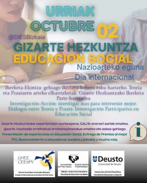 El Colegio de Educadoras y Educadores Sociales del País Vasco (GHEE-CEESPV) informa en su Web y en sus redes sociales (Facebook) de la celebración del Día de la Educación Social, 2 de octubre, en Bizkaia, cuya información compartimos: