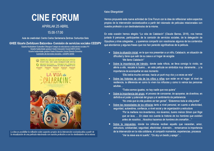 «La Comisión de Servicios sociales del Colegio ha propuesto una nueva actividad de Cine Forum con la idea de reflexionar sobre aspectos propios de la intervención socioeducativa a partir del visionado de películas relacionadas con nuestra profesión o con destinatarios/as de la misma. En esta ocasión han elegido “La vida de Calabacín” (Claude Barras, 2016)»