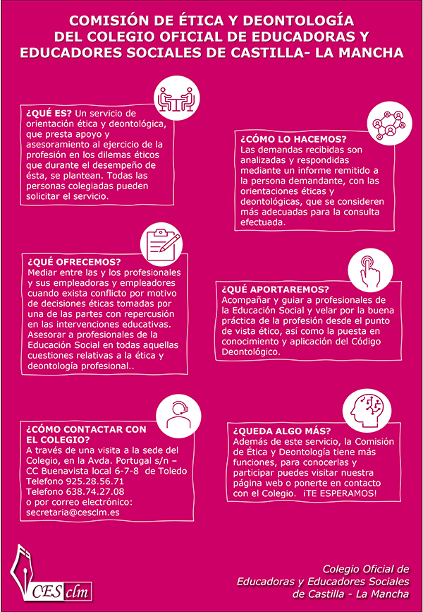 El Colegio Oficial de Educadoras y Educadores Sociales de de Castilla – La Mancha (CESCLM) pone disposición de todas las personas colegiadas, la COMISIÓN DE ÉTICA Y DEONTOLÓGIA, ofreciendo a los profesionales de la Educación Social, Apoyo y Asesoramiento Ético en el desarrollo de su profesión, para la mejora de la calidad de las intervenciones profesionales y bajo el amparo del Código Deontológico.