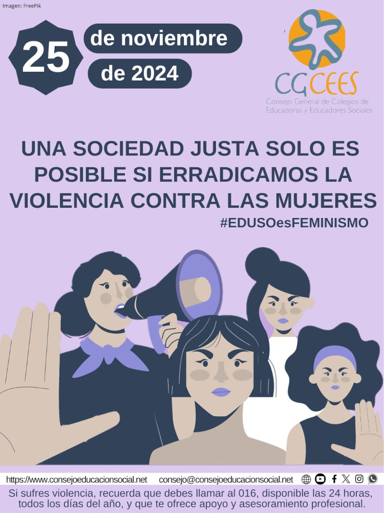 «En el Día Internacional de la Eliminación de la Violencia contra la Mujer, desde el Consejo General de Colegios Oficiales de Educadoras y Educadores Sociales, queremos manifestar nuestro firme compromiso con la erradicación de todas las formas de violencia machista y nuestra convicción de que la Educación Social desempeña un papel clave en la prevención, intervención y acompañamiento en estos contextos.