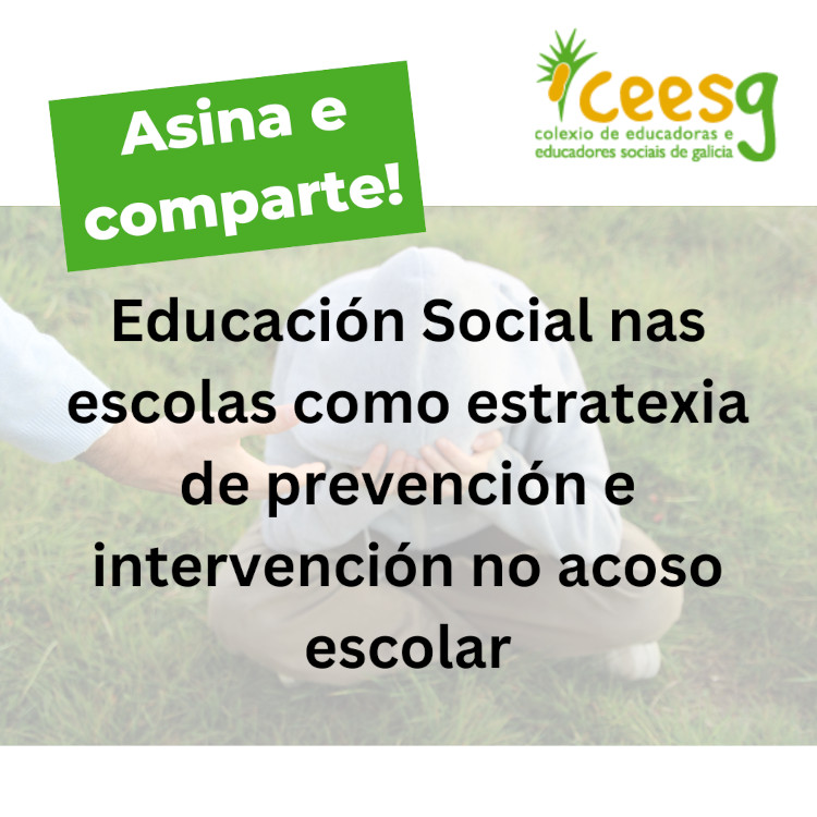 Con el inicio del próximo Día contra el acoso escolar (2 de mayo), hemos activado una petición en change.org a través de la cual queremos pedir al Ministerio de Educación, una vez más. la incorporación de la Educación Social en el sistema educativo, como estrategia para la prevención e intervención de estas situaciones. Desde el Ceesg llevamos años reclamando esta necesidad, y ahora nos encontramos en un momento idóneo, en el que cada vez hay más conciencia social sobre el acoso escolar y en el que la Xunta de Galicia debe poner en marcha la implantación de la figura del coordinador de bienestar y protección en todos centros educativos.