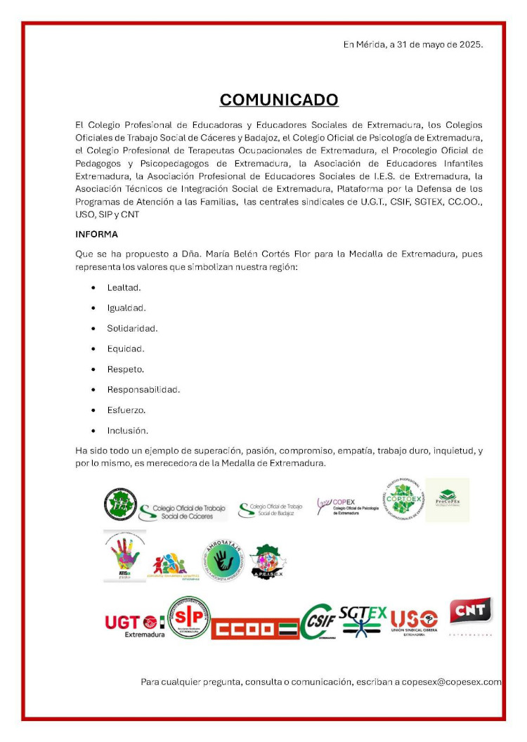 El Colegio Profesional de Educadoras y Educadores Sociales de Extremadura (COPESEX)  a propuesto, entre otras entidades del comunicado adjunto, a la profesional y compañera Dña. María Belén Cortés Flor para la Medalla de Extremadura.