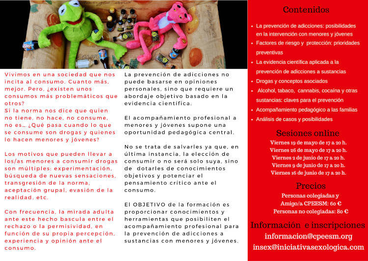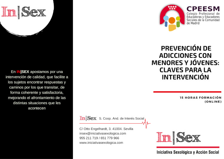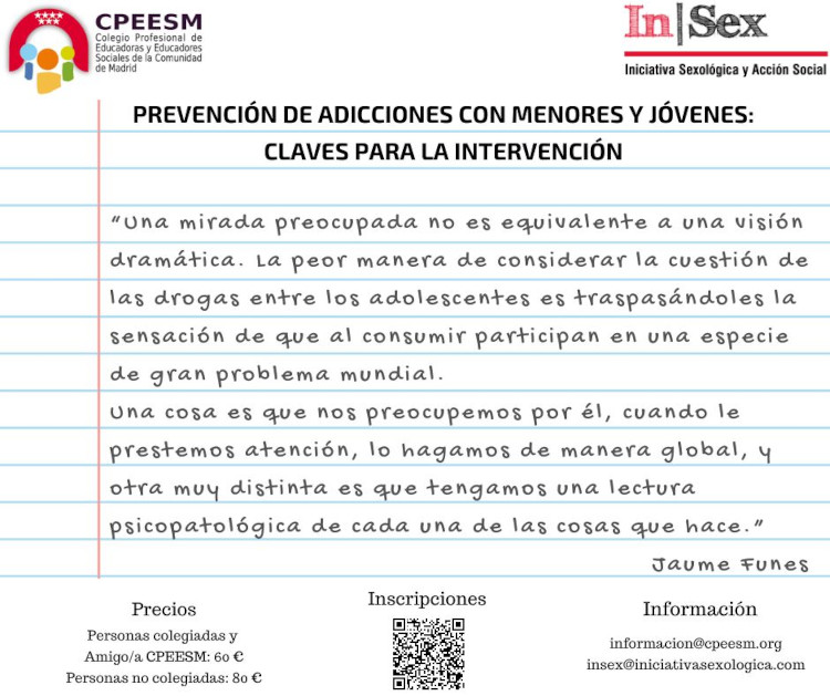 Descripción: Colegio Profesional de Educadoras/es Sociales de la Comunidad de Madrid (CPEESM) con colaboración de Insex, convoca la acción formativa “Prevención de adicciones con menores y jóvenes: Claves para la intervención”