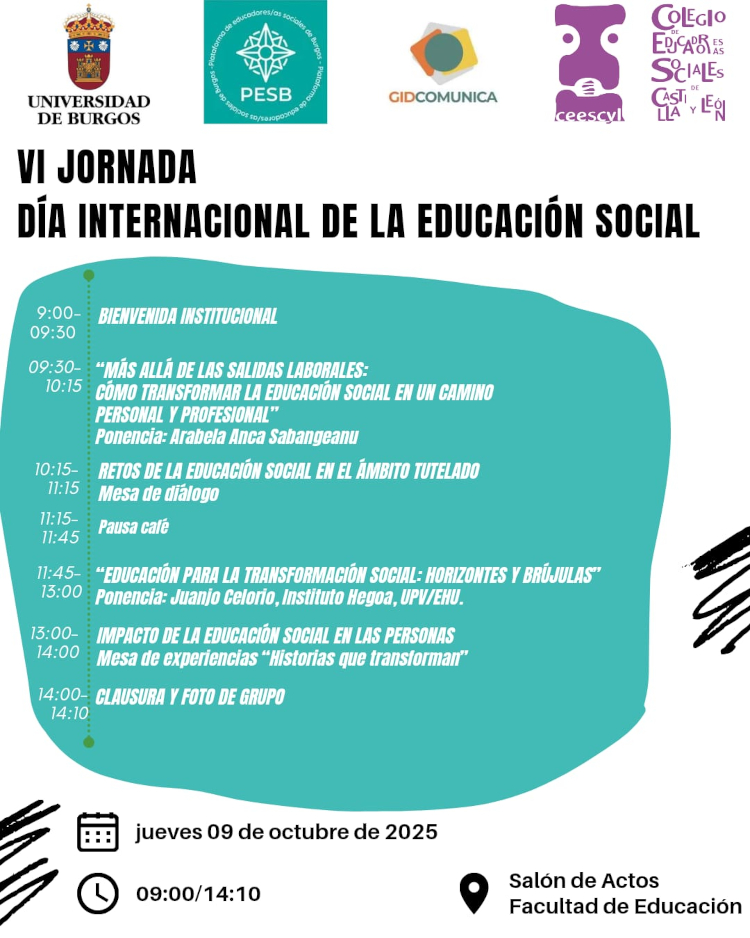 • 9 octubre 2025. Facultad de Educación UBU.  VI Jornadas celebración Día Internacional de la Educación Social «Transformar, Cuidar y Avanzar», con la participación de representante del CEESCYL.   pdfPrograma (170 KB) Más información