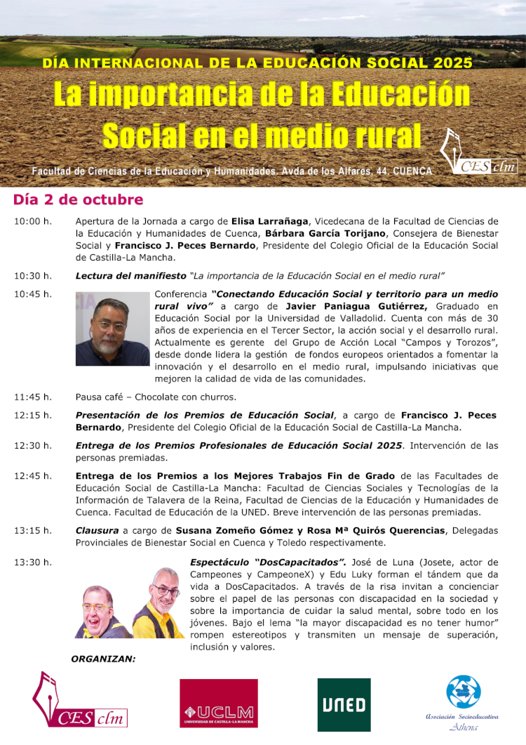 10:45 h. Conferencia ““Conectando Educación Social y territorio para un medio rural vivo” a cargo de Javier Paniagua Gutiérrez, Graduado en Educación Social por la Universidad de Valladolid. Cuenta con más de 30 años de experiencia en el Tercer Sector, la acción social y el desarrollo rural. Actualmente es gerente del Grupo de Acción Local “Campos y Torozos”, desde donde lidera la gestión de fondos europeos orientados a fomentar la innovación y el desarrollo en el medio rural, impulsando iniciativas que mejoren la calidad de vida de las comunidades.