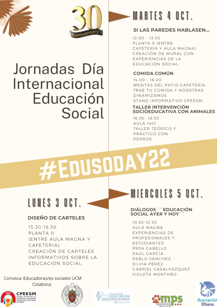 En el marco de las Jornadas del Día Internacional de la Educación Social, que se celebran en la Universidad Complutense de Madrid, del 3 al 5 de octubre, se realiza la actividad: Diálogos “Educación social ayer y hoy”, en la que participa Pablo Sánchez, miembro de junta directiva del Colegio Profesional de Educadoras y Educadores Sociales de la Comunidad de Madrid (CPEESM)