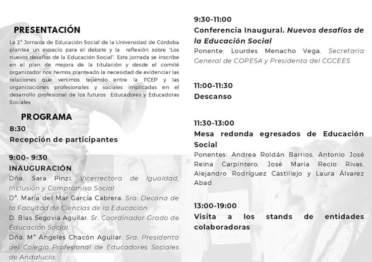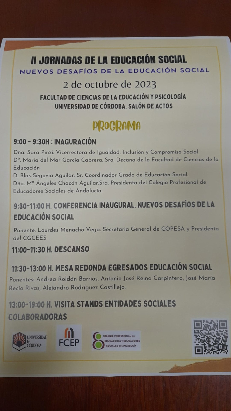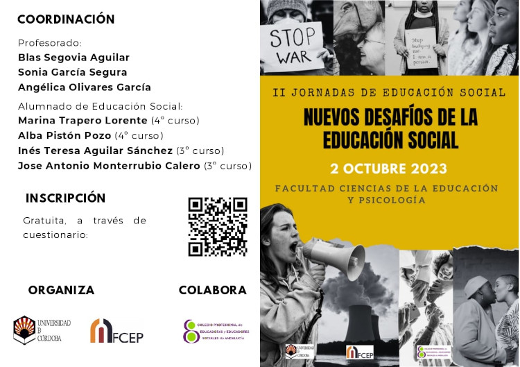 La Facultad de Ciencias de la Educación y Psicología de la Universidad de Córdoba (FCEP), con la colaboración del Colegio Profesional de Educadoras y Educadoras y Educadores Sociales de Andalucía (CoPESA), organiza el 2 de octubre de 2023, coincidiendo con la celebración del Día Internacional de Educación Social, la II Jornada de Educación Social, con el lema Nuevos Desafíos de la Educación Social.