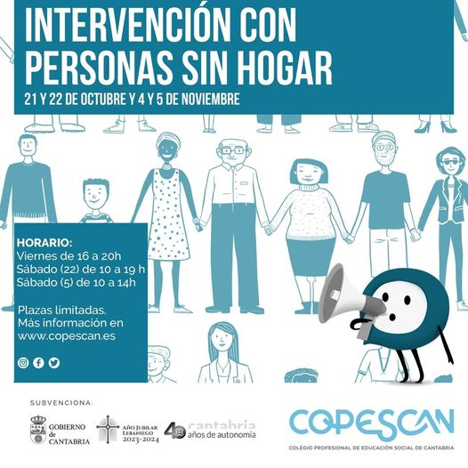 El Colegio Profesional de Educación Social de Cantabria (COPESCAN) organiza el curso: «Intervención con personas sin hogar«, que se realizará en formato online, los día 21 y 22 de octubre y, 4 y 5 de noviembre, viernes tarde y sábados.