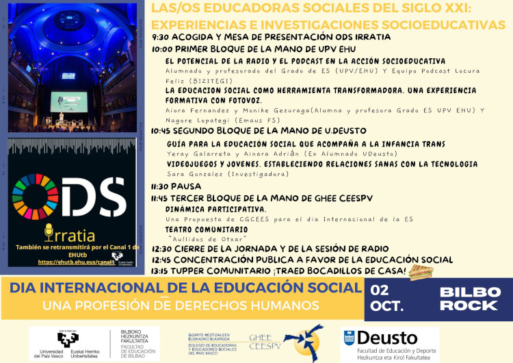 El Colegio Profesional de Educadores/as Sociales País vasco (CEESPV-GHEE) tiene previsto una de las celebraciones del Día de la Educación Social (2 de octubre) también en Bizkaia, en Bilbo Rock el próximo 2 de octubre, de la mano de UPV/EHU, y Universidad de Deusto