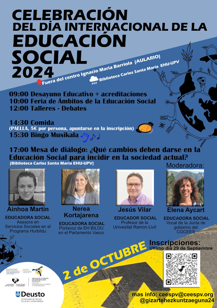 El Colegio Profesional de Educadores/as Sociales País vasco (CEESPV-GHEE) tiene previsto una de las celebraciones del Día de la Educación Social (2 de octubre) en Gipuzkoa con una jornada. Para participar hay que reservar plaza antes del 29 de septiembre escaneando el QR en el cartel e informan que para estar al día de todas las novedades, se aconseja seguir el Instagram: @gizartehezkuntzaeguna24