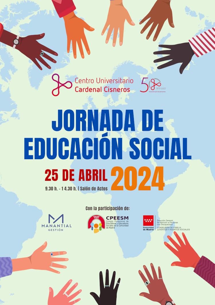 Descripción: El próximo jueves 25 de abril, el Centro Universitario Cardenal Cisneros, con la participación del Colegio Profesional de Educadoras y Educadores Sociales de la Comunidad de Madrid (CPEESM), organiza la Jornada de Educación Social 2024, dirigidas a todos los estudiantes del Grado en Educación Social del centro.