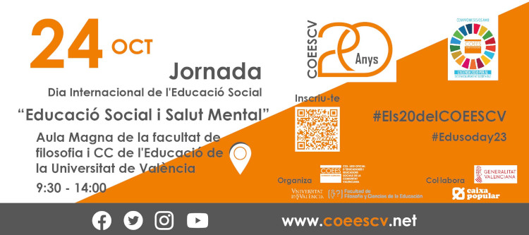 El Col·legi Oficial d’Educadores i Educadors Socials de la Comunitat Valenciana (COEESCV) informa  en su web de Jornada presencial “Jornada “Educación Social y Salud Mental», que se celebrará el 24 de octubre, de 9.30 a 14h. en el Aula Magna de la Facultad de Filosofía y CC. de la Educación de la Universitat de València.