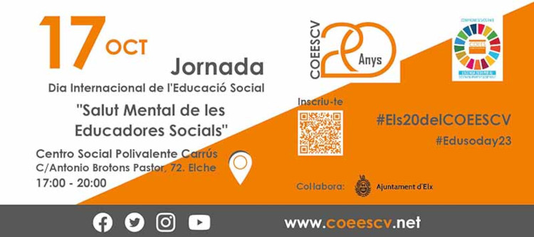 El Col·legi Oficial d’Educadores i Educadors Socials de la Comunitat Valenciana (COEESCV) informa  en su web de Jornada presencial “Salud Mental de las educadoras sociales”, que se celebra 17 de octubre en Elche, para celebrar el Día Internacional de la Educación Social y los 20 años de la fundación del COEESCV.