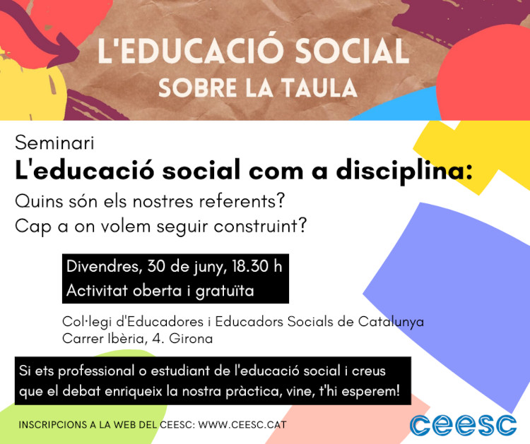 El Col·legi d’Educadores i Educadors Socials de Catalunya (CEESC), organiza la formación: La educación social como disciplina: ¿Cuáles son nuestros referentes? ¿Hacia dónde queremos seguir construyendo? en el proyecto «Seminari Educació Social Sobre la Taula» a Girona: «Seminario de ESST – Educación Social Sobre la Mesa» en Girona