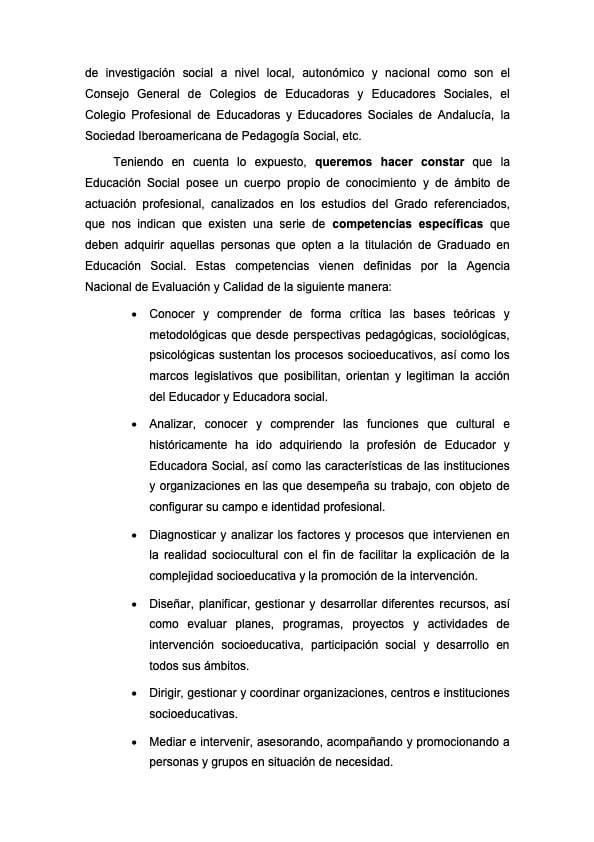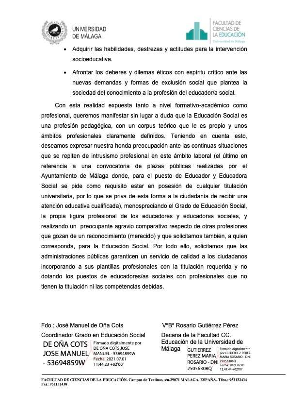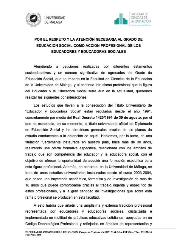 «Atendiendo a peticiones realizadas por diferentes estamentos socioeducativos y un número significativo de egresados del Grado de Educación Social , que se imparte en la Facultad de Educación de la Universidad de Málaga, y al continuo intrusismo profesional que la figura del Educador y la Educadora Social sufre aún en la actualidad, queremos realizar las siguientes consideraciones: …»