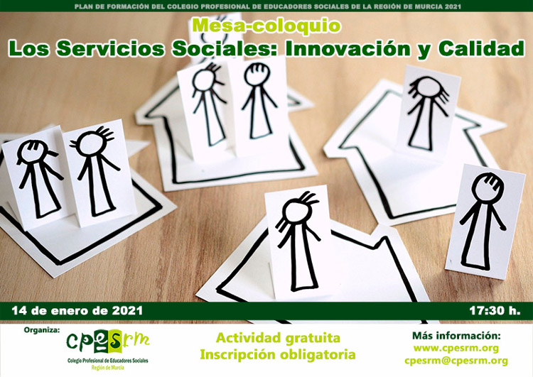 El Colegio Profesional de Educadores Sociales de la Región de Murcia (CPESRM) organiza el próximo 14 de enero de Enero a las 17:30 h. la Mesa-coloquio virtual “Los Servicios Sociales: Innovación y Calidad”.