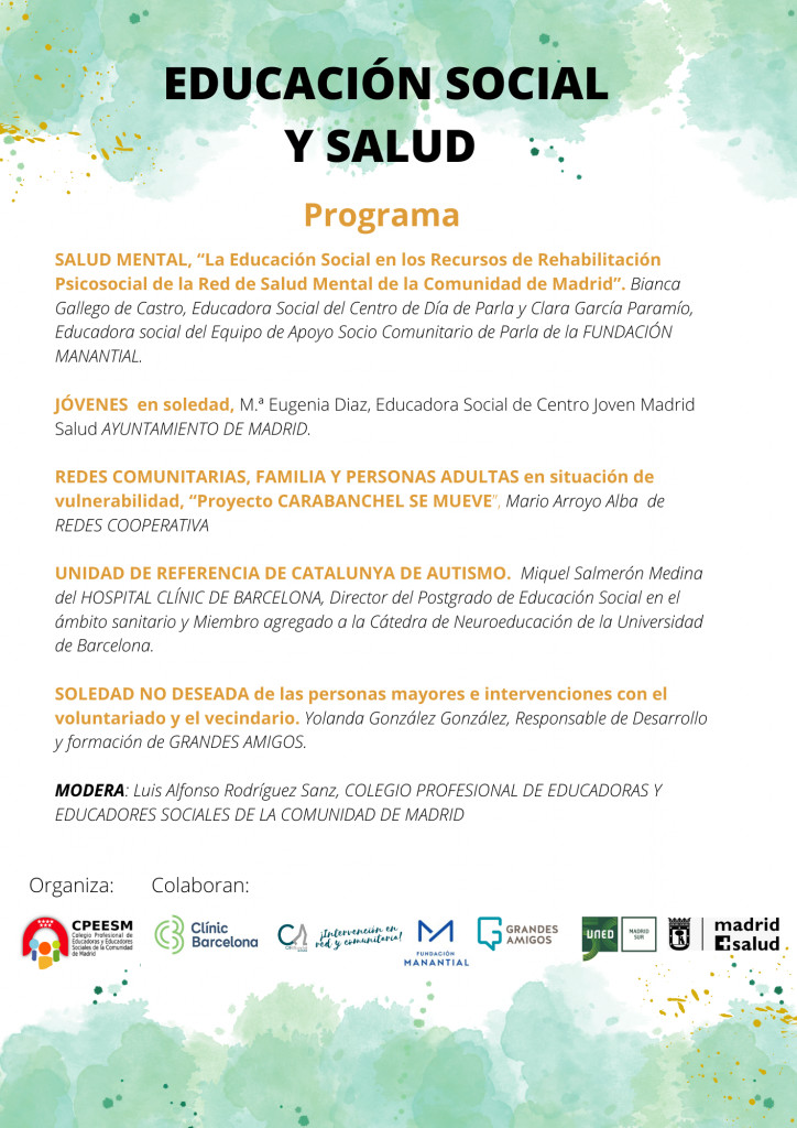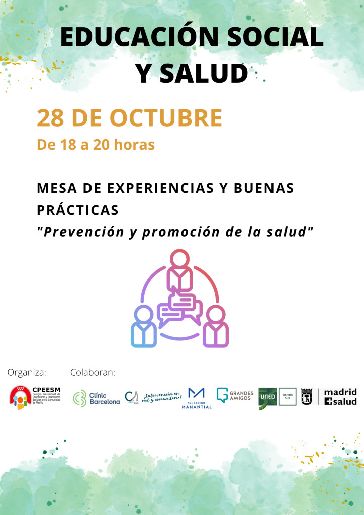 El Colegio Profesional de Educadoras y Educadores Sociales de la Comunidad de Madrid (CPEESM) organiza, dentro de la actividades organizadas a lo largo del mes de octubre, con motivo de la celebración del Día Internacional de la Educación Social,  una Mesa de experiencias y buenas prácticas: «Prevención y promoción de la salud» , que se realizará el 28 de octubre de 2022, a las 18:00 horas, en formato online, cuya participación es gratuita previa inscripción en el siguiente enlace