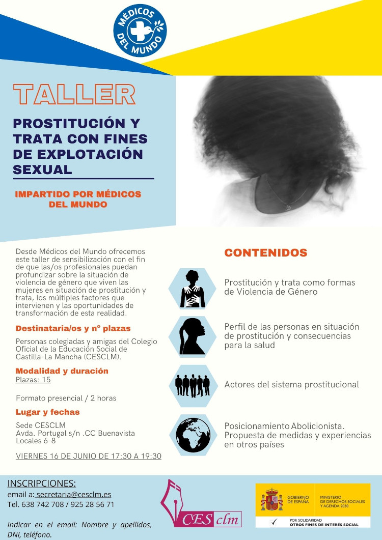 Médicos del Mundo, en colaboración con el Colegio Oficial de Educadoras y Educadores Sociales de Castilla La Mancha (CESCLM)  organizan el Taller: “Prostitución y trata con fines de explotación sexual”, que se impartirá el viernes 16 de junio en la sede del Colegio (Toledo).