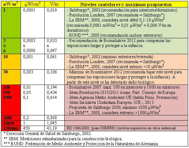 Por el contrario, los hallazgos científicos aconsejan niveles máximos de exposición a los CEM cada vez más bajos. Así lo evidencia, por ejemplo, las recomendaciones del Grupo BioInitiative (2007 y 2012). En la siguiente Tabla recogemos algunas medidas de uso frecuente. La columna de la derecha recoge distintas recomendaciones que sobre niveles máximos y cautelares se han venido vertiendo (la mayoría con un soporte científico riguroso), advirtiendo que esas diferencias pueden llegar a ser vitales para muchas personas. El reconocido científico a nivel mundial, Olle Johansson, del Instituto Karolinska, insiste en ello.