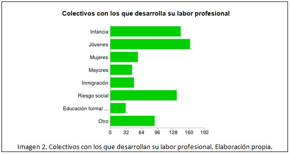 Respecto a los colectivos con los cuales desarrollan su labor profesional, hemos de indicar que se permitía señalar más de uno, atendiendo a la realidad de la educación social, donde el día a día de los y las profesionales es flexible.