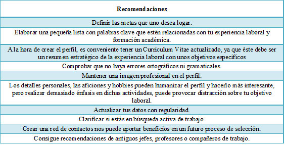 Tabla 3. Aspectos a tener presentes en LinkendIn
