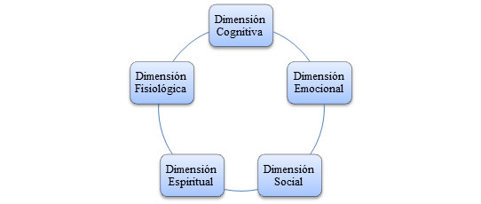 Su modo de pensar, de percibir y comprenderse tanto a sí mismo como su alrededor (Cognitiva); su manera de sentir, como vive las emociones, como las expresa y como las percibe (Emocional); sus herramientas para socializarse, sus grupos de apoyo y personas de referencia (Social); los valores y principios de la persona y sus creencias íntimas en lo espiritual (Espiritual); y su manera de expresar con el cuerpo la situación de sufrimiento (Fisiológica).