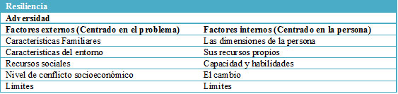 La adversidad, en este caso caracterizada por la situación crítica laboral junto con la situación de desahucios, se puede definir como una circunstancia en la que se abre un proceso de resiliencia donde intervienen factores externos e internos. En la tabla siguiente expongo el comienzo de esta explicación donde tengo en cuenta solo algunos de los factores que pueden formar parte del enfrentamiento de esta adversidad.