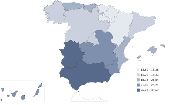 Respecto a la tasa de paro en Andalucía, si observamos los datos ofrecidos por el Instituto Nacional de Estadística (de ahora en adelante INE), notamos que Andalucía es la segunda comunidad autónoma con mayor tasa de paro (29,70%) solo superada por Melilla (30,67%).