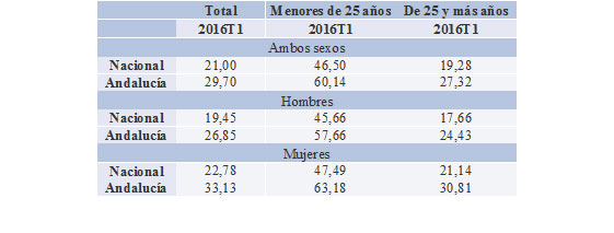 Los últimos datos ofrecidos por la Encuesta de Población Activa (de ahora en adelante EPA), relativos al primer trimestre de 2016, indican que la tasa de paro en España es de un 21%. Atendiendo al sexo, es más elevada en mujeres (22,78%) que en hombres (19,45%). Por grupos de edad, las cifras son más alarmantes, siendo la tasa de paro de los y las jóvenes menores de 20 años del 64,12%, de los y las jóvenes de entre 20 y 24 años del 43,26% y del grupo de edad de 25 a 29 años del 28,39%.