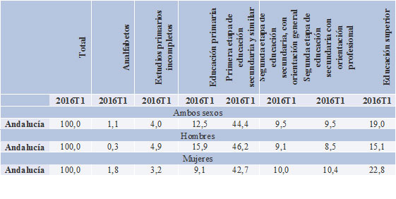 En cuanto a la tasa de paro de los andaluces según el nivel formativo alcanzado, observamos que la tasa de paro más elevada se corresponde con las personas que tienen primera etapa de educación secundaria y similar (44,4%), siendo en los hombres el sexo en que más incide (46,2%). La tasa de paro de los andaluces y andaluzas que han alcanzado la segunda etapa de educación secundaria y estudios de nivel superior a esta etapa es mucho más baja y se reduce a más de la mitad. Por tanto, como decíamos, es erróneo pensar que el nivel formativo no contribuye a la mejora de la empleabilidad.