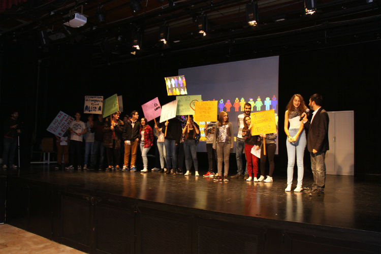 Fase-2: Foro local por la convivencia: es un espacio de encuentro de todos los grupos de alumnos que participaron los ciclos de talleres, con el propósito de poner en común las acciones de sensibilización que cada uno había preparado, así como para dar un poderoso mensaje público de reconocimiento y defensa del tema de la campaña. Desde una perspectiva estratégica entendemos que este acto es un pilar fundamental de la intervención, ya que –después de años de continuidad- constituye un referente en el contexto educativo local por su carácter festivo, de defensa de la diversidad y rechazo de la discriminación. Los elementos clave de este evento son: (1) Intervención del alcalde/sa del municipio, (2) Presentación de las acciones de sensibilización preparadas por los alumnos, (3) Presentación de una acción de sensibilización preparada por el profesorado (4) Cobertura del encuentro por parte de la prensa local, (5) Grabación audiovisual del evento para la posterior elaboración de un video resumen de la campaña (ver video en el siguiente enlace).