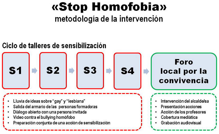 Fase-1: Ciclo de talleres de sensibilización: en cada uno de los centros participantes realizamos una serie de entre 3 y 5 talleres de 2 horas de duración con el propósito de (a) desmontar los estereotipos sobre la homosexualidad, (b) presentar referentes positivos y no estereotipados de personas homosexuales y (c) crear de manera colectiva una acción de sensibilización sobre el tema para presentarla en el Foro local por la convivencia. Para cumplir estos objetivos realizamos diversas actividades: (a) Lluvia de ideas sobre las palabras “gay” y “lesbiana”; (b) “salida del armario” de las personas formadoras; (c) diálogo abierto con una persona homosexual -del propio centro o invitada; (d) presentación de un conjunto de fotografías de personajes públicos LGBT de diversos entornos sociales; (e) proyección de un video contra el bullying homófobo; y (f) Preparación conjunta de una acción de sensibilización, a través de técnicas artísticas.