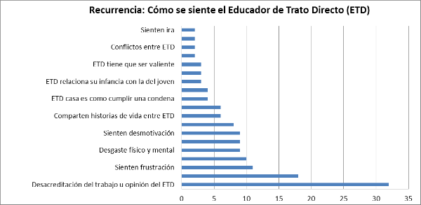 Se ha podido observar el descontento y el desgaste físico y mental de los/as educadores debido a que, entre otros aspectos, se sienten poco reconocidos en su labor e inseguros en su lugar de trabajo, lo que ha generado un aumento de inasistencia por bajas médicas. Probablemente esta situación se debe a su escasa preparación para manejar sus propias emociones al interior de un centro penitenciario donde se viven diariamente conflictos propios de los adolescentes que han cometido delito y que en su mayoría presenten consumo problemático de drogas e inestabilidad emocional.