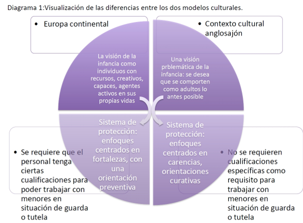 Existen similitudes fundamentales entre las sociedades de la Europa continental por cómo protegen a su infancia y adolescencia más vulnerable. El Reino Unido tiene una larga tradición en el trabajo social, mientras que dentro de la Europa continental la tradición se ha desarrollado además en la pedagogía social. Tanto en uno como en otro, la seguridad y el bienestar están en el centro de la legislación y la práctica laboral. Pero al mismo tiempo, existen diferencias en la forma de socializar y educar a la infancia y a la juventud entre los países de la Europa continental y en lo que se considera el enfoque principal en el Reino Unido. Estas diferencias se relacionan principalmente con diferentes construcciones sociales de la ‘imagen de la infancia’. Esto último se refiere a qué tipo de valor tiene la infancia y la juventud en su sociedad y con qué expectativas y aspiraciones viven. La atención prestada a esta idea ha ido variando, por ejemplo la sociología del desarrollo infantil, es importante en algunos ámbitos, pero rara vez se reconoce en otros, incluida la formulación de políticas. La imagen de la infancia en un lugar y tiempo determinado es una construcción social “siempre presente e influyente, pero en la formulación de políticas, por lo general se da por sobreeentendida y, por lo tanto, no se debate sobre ello“ (Moss, 2010).