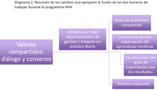 Sin embargo, la experiencia del programa HHH demostró que es posible integrar un enfoque socioeducativo como forma de trabajo en el sistema británico. Las pedagogas y pedagogos sociales experimentaron que al trabajar de forma igualitaria con sus colegas de trabajo social podían alcanzar una estructura compartida bien planificada y clara. Todo el equipo sabía lo que se esperaba de su práctica, había un marco donde la flexibilidad y la perspectiva holística de un abordaje socioeducativo podía prosperar. Cuando había confianza dentro del equipo, la transparencia derivaba de ello, y había apertura hacia los elementos reflexivos y creativos de la pedagogía social.