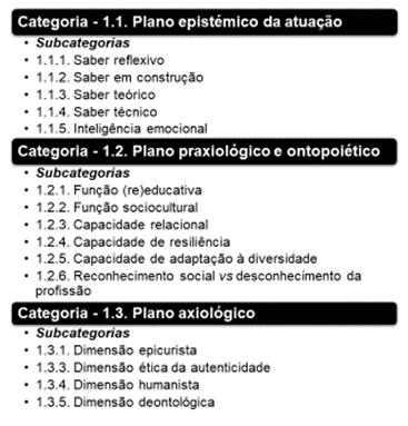 Na categoria 1.1. Plano epistémico de atuação sobressaem como subcategorias com maior número de ocorrências dos indicadores o entendimento do Educador Social como portador de um Saber em construção, com um total de 17 unidades de registo. Se é um facto que todo o conhecimento científico está em constante evolução, o que é destacado nos indicadores enunciados pelos estudantes: “aprendizagem”; “estudo”; “a vontade de aprender”; “aperfeiçoamento”, a valorização epistemológica do erro ganha aqui um reconhecimento que nem sempre é assumido por outros profissionais.